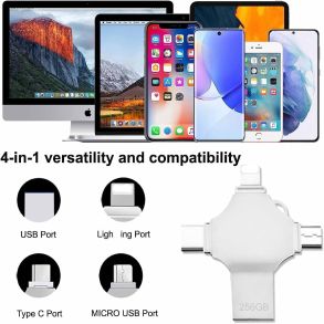 4-in-1 Universal Compatibility Equipped with Type-C, USB 3.0, micro USB, and Lightning connectors, this 256GB flash drive is compatible with iPhone, iPad, Android smartphones, MacBook, and Windows laptops—perfect for seamless data transfer across all your devices.