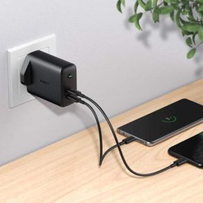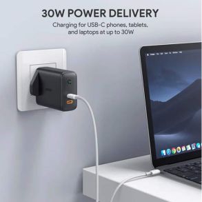 Dynamic Detect: Augmented with AUKEY Dynamic Detect, either USB-C port can output the full power of the charger with 30W Power Delivery when used on its own, and each port can output 18W Power Delivery when both are used together
