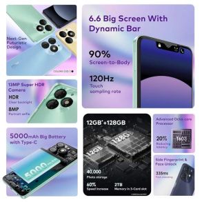 • Unleash the future of mobile technology with the Truly Awesome itel A70. Never run out of storage with a massive 256GB of storage. Multitask with ease with up to 12 GB RAM and enjoy a cinematic viewing experience with an expansive 6.6inch HD+ display that boasts 500 nits of peak brightness with dynamic display bar for notifications. Octa-core processor tackles demanding tasks and games with ease. Stay powered all day with the 5000mAh battery and Type-C Charging. and protect your privacy with side fingerprint sensor and face unlock. With its ultra-slim 8.6mm body and four eye-catching colors, you can express your unique style wherever you go.