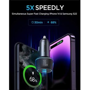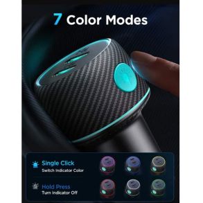 The product is a 70W multi-color car charger with a light button. It has dual PD output ports and provides fast charging for two devices simultaneously. The PD3.0, QC3.0, PPS, Samsung AFC fast charge protocols, and Huawei SCP superfast charge protocols are supported. It is designed with a light button to switch between seven light colors. The upper and lower LED rings can be turned off to avoid nighttime interference. With an intelligent recognition chip and proper current distribution, the product is harmless to your phone and car. Its fire-retardant PC material ensures safer charging with less heat.