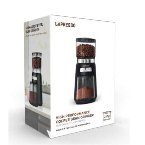 LePresso High Performance Coffee Bean user-friendly one-button design Grinder compatible to all kind of grinding purposes. With its burr grinding method and 20 bean grinding size, it can adjustably crush coffee beans from soft to coarse adaptable to all brewing methods. It is supplied with a 210g bean box and 120g powder cup capacity which means you have the ability to store coffee beans in a perfectly sealed tank and freshly grind whenever you need. This professional scaled device is efficiently light-weighted due to ABS material, and surprisingly durable thanks to the SUS430 corrosion resistance steel used in its manufacture. All-in-all, this high-performance grinder with its adjustable construction and durable lifecycle is a perfect choice for all coffee lovers out there.