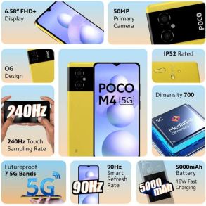 Exciting news! The Poco M4 5G is now available, and it's better than ever. This powerful device has a large 6.58-inch IPS LCD display, making it perfect for gaming, watching movies, or browsing the web. Plus, with a 13MP + 2MP rear camera and 5MP front camera, you'll be able to capture stunning photos and videos. And with the latest Android 12 operating system and a powerful MediaTek Dimensity 700 processor, this phone is fast, responsive and ready for anything. Plus, the massive 5000mAh battery ensures that you'll always have plenty of power to get through the day. So don't wait any longer, order your Poco M4 5G today!
