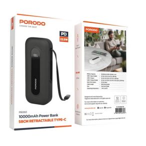 The Porodo 10000mAh Power Bank features a retractable 58cm Type-C cable for fast and quick charging on the move. This compact power bank houses a powerful battery capacity 10000mAh to assure PD 30W of output that will charge your device from 0% to 60% in just 35 minutes. Its built-in Type-C cable promises much convenience, while the multiport output allows simultaneous charging of several devices. Equipped with versatile input and output options, including USB-C up to 30W, this power bank will work on various devices. Operating temperatures between -10ºC and 60ºC let it perform efficiently both for everyday use and even for travel.