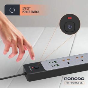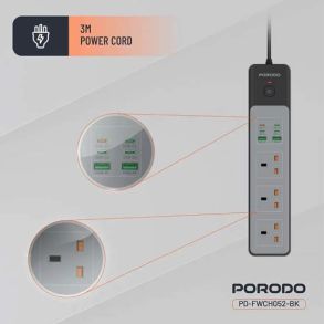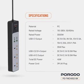 Porodo 3AC | 45W | 3000W Power Strip is the perfect charging solution for all modern needs. This beauty, with a 3000W power rating, can charge multiple high-power devices together. Made from PC material for durability, the power strip accepts a wide voltage of 110-265V and 50/60Hz, making it globally portable. Created to meet international standards, the power strip comes with a USB-C1 port that works perfectly for fast charging at 35W (5V/3A, 9V/3A, 12V/2.5A, 15V/2.33A, 20V/1.75A) and four additional ports (USB-C2/3/4, USB-A1/2) that together offer a total DC output of 45W. With built-in features and a safety power switch, it can counteract malpractice like overcurrent, overheating, and short circuits. The generous power cord is 3m-versatile enough for placement in homes, corporate debts, or traveling to places. Ideal for charging and powering multiple devices in a safe and efficient manner.