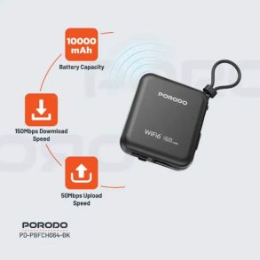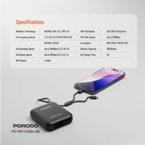 The Porodo 4G LTE | WiFi 6 Pocket Router is the ultimate portable connectivity solution, seamlessly merging high-speed internet with versatile charging. It assures seamless access to the internet from anywhere, thanks to the support of more LTE bands than ever before (B1/3/5/7/8/20/38/40/41), plus wireless technologies such as WCDMA, FDD-LTE, and TDD-LTE. It offers download speeds up to 150 Mbps and upload speeds up to 50 Mbps for continuous browsing and seamless streaming. Supporting up to 8 connected devices with WiFi 6 (IEEE 802.11 b/g/n/ax), it features a WiFi speed of as much as 229Mbps. Further enhanced with WPA-PSK & WPA2-PSK encryption, it lets all your devices securely connect to it. Furthermore, the inbuilt 10000mAh battery works as a power bank, with various outputs such as Type-C (up to 22.5W), USB-A (22.5W), and Lightning (5V/2A). This recharges completely in just 4 hours. This gadget, therefore, becomes most apt for the active lifestyle. Compact, powerful, and multifunctional, the Porodo Pocket Router keeps you connected and powered anywhere.