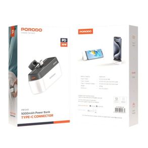 • The Porodo 5000mAh Power Bank with Type-C Connector is a new compact and big product that provides massive power to keep your device going. Equipped with a 5000mAh battery capacity, it will charge your smartphones and tablets throughout your busy day. You can quickly recharge the power bank with a Type-C input of 5V/2A, 9V/2A, and 18W. The Type-C output is capable of 20W to provide a fast charge. The exact impressive specifications go for producing the Type-C connector for versatile charging. With Power Delivery-PD 20W, rest assured that this power bank keeps your devices charging fast. With a compact and portable design, a Porodo power bank will fit easily into your bag or even your pocket—ensuring that wherever you go, you have reliable power. Whether traveling at work or simply out and about, the Porodo 5000mAh Power Bank with Type-C Connector is there for you whenever you need a way to keep you charged and connected.