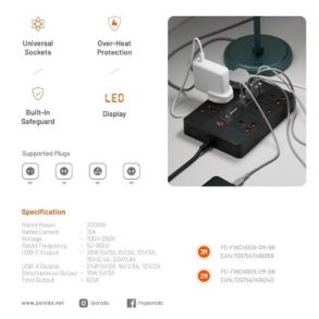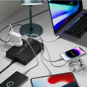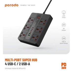 To satisfy everyone's demands and expectations, Porodo Multi-Port Super Hub was specially created to serve the purpose. Multiple-device charging is ideal with the multiport super hub. In addition, it has six AC sockets that can concurrently power six devices up to 3000W. The super hub introduces four sets of USB-C ports and two sets of USB-A ports with 36W and 24W power delivery respectively. The Porodo multi-port super hub offers a structured and peaceful work environment. You no longer necessary to utilize several USB or wall chargers. All of your charging requirements are met by the 6 AC outlets and 6 USB ports. Set the time and conserve energy. Every home or business has several electronic gadgets, but they don't all need to be on all day. For instance, a coffee maker might not be used continuously throughout the day, so you can set a timer and turn it off when finished. The benefit of the built-in switch is that it protects your gadgets from overload. The overload button is specifically built to activate whenever the power reaches 3000W. The Porodo Super Hub has a distinguished design with 6 AC sockets. This gadget supports plugs from 150+ countries in the world.