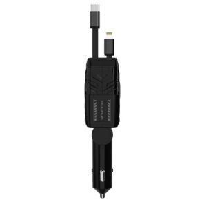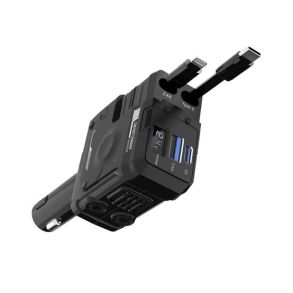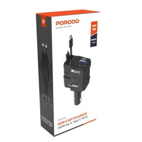 The Porodo 66W Car Charger with Lightning and Type-C cables ensures fast and efficient charging on the go. With a wide input range of 12-24V, it is compatible with most vehicles and offers a total output of 66W, supporting simultaneous charging for multiple devices. It features a USB-A output of 5V/2.4A (12W) and a USB-C output of 5V/3A (15W), along with built-in Type-C (5V/3A, 9V/3A, 12V/3A, 36W) and Lightning (5V/2.4A, 12W) cables, catering to a variety of devices. The 80cm cable length provides convenient reach, and the voltage monitor adds safety by keeping track of the car battery’s health. With universal compatibility and a compact design, this car charger is an essential accessory for reliable on-road charging.