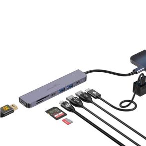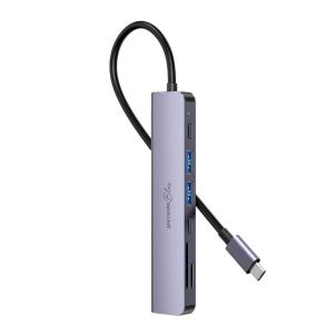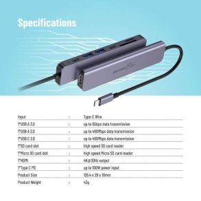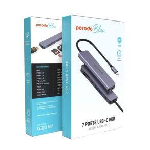 Porodo 7 In 1 Hub HDMI 2XUSB-A 2XUSB-C SD MicroSD is exactly what you need! It transfers data with high-speed micro SD and SD card readers. USB-A 2.0 and USB-C ports ensure swift data transmission up to 480Mbps, while USB-A 3.0 takes it a notch higher with speeds of up to 5Gbps. Type-C PD port supports power inputs of up to 100W, offering efficient charging. Integrate your multimedia experience with hub's HDMI output, delivering 4K resolution at 30Hz.This hub is a perfect choice for efficient data management and multimedia connectivity.