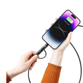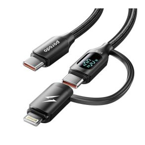 The "Porodo 2-IN-1 Charging Cable with Digital Display" is a versatile and efficient accessory for modern electronic devices. Measuring 1.2 meters in length, it offers ample reach for convenient charging and data transfer. The cable is durably constructed with an aluminum alloy and reinforced with a braided wire design, ensuring longevity and resistance to wear and tear. It features a dual charging interface, equipped with a USB-C PD (Power Delivery) capable of delivering up to 100W for rapid charging, alongside a Lightning connector supporting 20W power output. This combination makes it ideal for a wide range of devices including smartphones, tablets, and laptops. Additionally, the cable boasts a high-speed 480Mbps transmission rate, enabling quick and efficient data transfer. Its integrated digital display adds a modern touch, providing real-time monitoring of charging status and power flow.