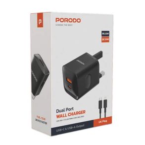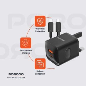 The powerful and efficient Porodo Dual Port Wall Charger UK with Type-C Cable keeps all your different devices easily charged. This versatile wall charger comes with a rated voltage of 100-240V and a rated frequency of 50/60Hz, hence very suitable for wide usage in different regions. It has multiple options for output: USB-A provides 9V/2A, 12V/1.5A, and 5V/4A-up to 20W for fast charging of most devices, while USB-C can provide 9V/2.22A, 12V/1.67A, and 5V/4A up to 20W for fast charging of compatible devices. With up to 20W shared output, you can charge several devices, making it a good companion for home and traveling. Among the features, it has an over-heat protection to avoid overheating this charger during use, making charging relatively safe.
