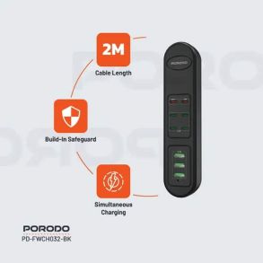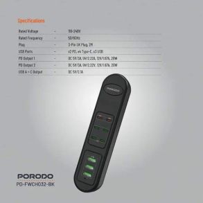 The Porodo 50W Multi-Port USB Charging HUB is the most powerful and versatile solution for charging several devices simultaneously. With a universal input range of 110-240V and a rated frequency of 50/60Hz, the charging hub is perfect for global use. It is equipped with a 3-Pin UK plug, with nine charging ports: two 20W PD, four Type-C, and three USB-A for vast arrays of device charging. Each PD port can provide up to 20W output for fast-charging smartphones and tablets, while all USB-A and USB-C ports offer 5V/2.1A output for smaller gadgets. This 2-meter cable will let you enjoy flexible placing options, and the built-in safety mechanisms protect your devices against overcharging, overheating, and short circuits. Compact and efficient, this will be an essential accessory for homes and offices on the go.