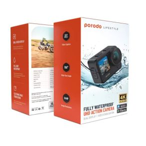 Porodo Lifestyle Fully Waterproof UHD Action Camera is designed for capturing eyes catching photos and videos in any environment. With a waterproof capability of up to 21 meters, this camera is perfect for underwater exploration and activities in challenging conditions. It features a 2.0" Touch IPS and secondary 1.3" IPS screen to offer easy playback and image viewing. 4K video recording and a high photo resolution of 24 megapixels are supported, all to ensure your memories will be captured in exceptional detail. Wireless connectivity with built-in WiFi support and expandable storage via Micro SD card, up to 128GB are also included. Compatible with various video resolutions, including 4K, 2.7K, 1080P, and 720P, this camera offers plenty of recording options for any situation. You can select from a range of photo shooting modes, such as Photo, Auto, Burst, and Timer, or choose from a variety of video shooting modes, like Standard Video, Slow motion, Loop recording, and Time-lapse.The Porodo Lifestyle Fully Waterproof UHD Action Camera is an excellent gadget for your most exciting experiences, both above and below the surface.