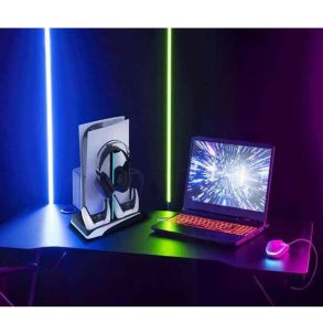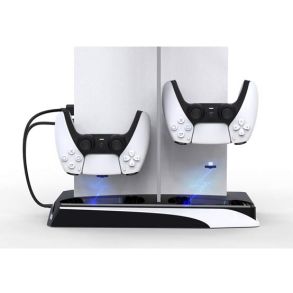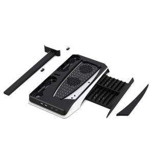 The Porodo Gaming PS5 Cooling and Charging Hub is a multi-functional accessory that offers several benefits. Firstly, it is designed to cool your PS5 consoles with maximum speed, ensuring optimal performance. Additionally, it serves as a hub for charging other devices. To enhance convenience, the device is equipped with a magnetic detachable accessory that securely fixes both the PS5 disc version and digital version consoles which helps to keep the consoles running cool and quiet. Moreover, the hub includes two detachable Type-C adapter charging ports, allowing for simultaneous charging of two PS5 controllers. Furthermore, the hub features two USB HUB expansion ports. One of these ports supports data transfer via USB-A, while the other is dedicated solely to power supply. Additionally, the product includes a dual-head USB-A male port to USB-C male port data cable slot, cleverly hidden at the bottom for convenient storage. In addition to its functionality, the device also offers additional features. It includes a headphone stand, providing a designated spot to store your gaming headphones. Furthermore, the versatile devices feature a 12-disc storage compartment, ensuring easy organization of your game collection. Lastly, the hub is equipped with RGB lighting, adding a visually appealing element to your gaming setup. With its impressive range of features, It’s an all-in-one solution for your gaming needs.