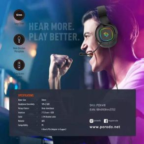 Immerse yourself in high-quality sound with the Porodo Gaming RGB Headphone. These headphones deliver crisp, clear audio because they Feature 50mm drivers. The omnidirectional microphone ensures your voice is heard clearly and it can be detached when not in use. Compatible with PC, Xbox, and PS4, this headphone is versatile for all your gaming needs. The 2.1M braided cable provides durability, and the RGB lighting adds a stylish edge to your gaming gear.