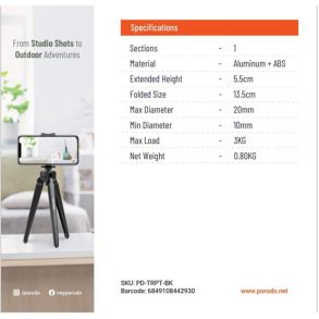 Porodo Table Tripod with Phone Holder PD-TRPH-BK - Black