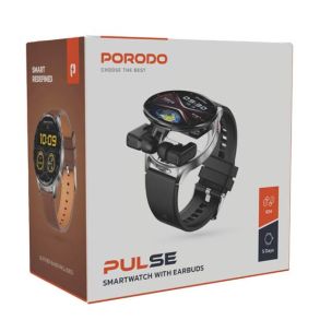 • Porodo Pulse Smartwatch with Earbuds is a package of innovation, convenience and style. What you're going to have is a sleek smartwatch, equipped with a 300mAh battery and a 360 x 360 IPS display, along with earbuds which are placed beneath the screen, coming with silicone ear tips and powered by 25mAh battery. The smartwatch offers up to 5 days of working time, while the earbuds provide 10 hours of working time. A high resolution IPS display and powerful JL7012F6 chipset, make the Porodo Pulse Smartwatch deliver smooth and responsive performance for a variety of features it has such as activity tracking, heart rate and calorie tracking, pedometer, sleep monitoring and many more. You also have a leather strap included in the package, which you can replace it with the silicone one whenever you want. Stay connected, informed, and entertained with the Porodo Pulse Smartwatch with Earbuds.