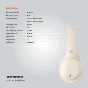 • The Porodo Soundtec PRIMO Wireless Headphone combines premium audio with innovative features targeted at music lovers and gamers. With 40mm drivers, it certainly guarantees rich quality sound; the low latency in its game mode promises smooth audio-visual synchronization for an immersive feeling during serious gaming. Advanced ENC technology covers a person from background noise to ensure crystal-clear calls. Enjoy extended listening via the robust 400mAh battery for up to 50 hours of playtime at 50% volume or 44 hours at total volume. Recharge in as little as 1.5 hours via the Type-C port. Besides, Bluetooth V5.4 provides stable connectivity up to 15 m. The PRIMO represents clear and detailed sound with an impedance of 2?, and sensitivity is 103 ± 3 dB. It also features a Voice Assistant for hands-free music and calls, adding convenience. It is ideal for both casual music listening and intense gaming.