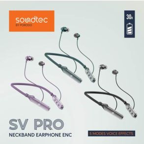 The Porodo Soundtec SV Pro Neckband Earphone ENC will provide you with next-level audio skills. It is equipped with the most recent Bluetooth V5.3 technology, which guarantees a strong connection within a 10m range. Environmental Noise Reduction and the modern ENC function on the earphones ensure crystal clear music in every situation. 5 various voice effects, from the joyful tones of "Cartoon" to the deep resonance of "Male," will transport you to a wonderful realm. These earbuds are built for constant use with a stunning 30H of play, 130H of standby time, and a quick 2H recharging time through a Type-C connector. Durability is ensured by the 250mAh battery, which is also long-lasting. The user interface is simple thanks to the easy control buttons and the magnetic earphones keep them stable. Welcome to Porodo's unmatched musical trip.