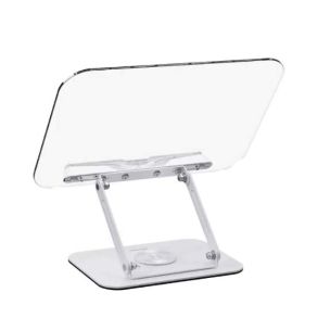 Introducing the Porodo Transparent 360° Rotatable and Angle Adjustable Tablet Stand, a perfect combination of functionality and aesthetics, ideal for browsing, reading, and drawing. Made from robust carbon steel and featuring an acrylic plate, this stand includes a stainless-steel rotatable component for flexible orientation. The innovative folding design ensures it is compact for storage and portable for transportation. It comes with a versatile clip to securely hold books, tablets, or drawing tools. The height of the stand is adjustable from 0 to 38 cm, offering an optimal ergonomic setup for various activities. Suitable for a range of uses, this stand is a must-have for enhancing your reading, browsing, or creative experiences with comfort and style.