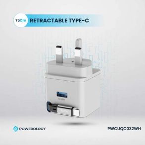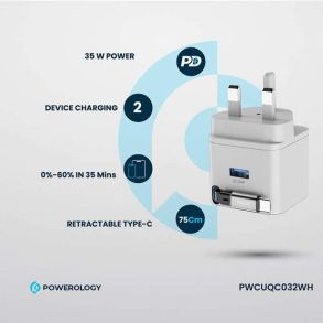 • The Powerology Dual Port Retractable GaN Charger offers a dependable and effective charging experience by combining modern technology with functionality. With a maximum output of 35W and a retractable USB-C cable length of 75 cm, this charger ensures quick charging for compatible devices. It is ideal for powering several devices at once. The USB-A port can supply up to 18W. The two ports together support dual-device charging with a combined output of 15W. For safety, the durable matte fireproof PC material supports the latest GaN tech. It ensures an effective power supply while reducing heat. It has a UK 3-pin connector and handles AC 100-240V input. Every charge brings peace of mind. Its design has built-in protections against overheating. The Powerology Dual Port Retractable GaN Charger is compact and easy to use. It charges devices from 0% to 60% in 35 minutes. For modern gadget buyers, it's the best charging option, whether for daily use or travel.