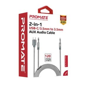 Promate AUXLink-CM 2-in-1 USB-C/3.5mm to 3.5mm AUX Audio Cable - Grey