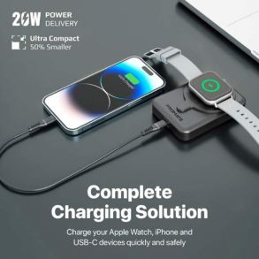 • Wirelessly charge your iPhone and Apple Watch in a snap with PowerMag-Duo. It features a 15W MagSafe charging module that perfectly aligns with the iPhone 14 series for QuickSnap charging. The Apple Watch magnetic charging pad, aligns with your Apple Watch and charges your devices at 3W speed ON THE GO. The 20W Power Delivery ports let you charge your USB-C devices up to 4X faster. PowerMag-Duo’s portable and lightweight design let you charge your device, even when on the move.