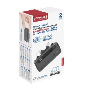 Promate PowerUp-Duo 5000mAh Powerbank with Foldable USB-C and Lightning Connectors - Black