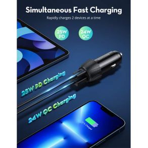 RAVPOWER 49W car charger supporting PD 25W(Max) and QC 24W(Max) high output, can fast charge all prevailing phones at the same time.