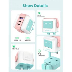 Robot Design, make charging more fun: UGREEN Uno Charger 65W has 2 USB C ports and 1 USB A port, which can fast charge your phone, tablet and other devices, and USB-C laptop from a single charger port. The unique,cute robot design makes the charging different.