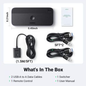 The Ugreen CM662 USB 3.0 switch is a reliable device that enables easy and fast data exchange between two computers, while maintaining high performance and compatibility with a variety of devices. Fast data transfer up to 5 Gb/s allows you to copy and share files instantly. Ease of use thanks to the button on the housing and the remote control makes connection management simple and intuitive. Thanks to wide compatibility with operating systems and the Plug & Play function, the device is ready for use immediately after connection, without the need to install additional drivers.
